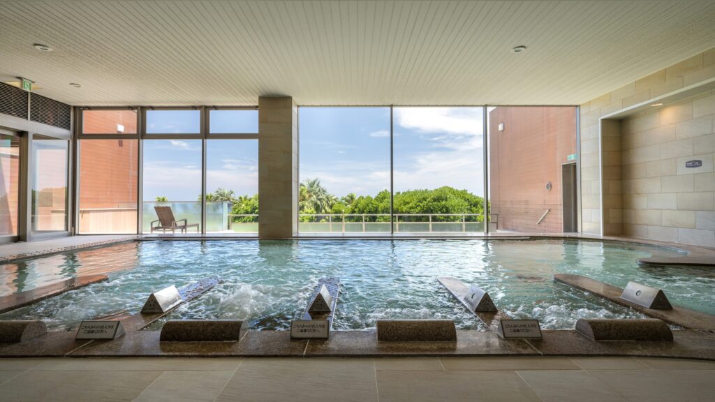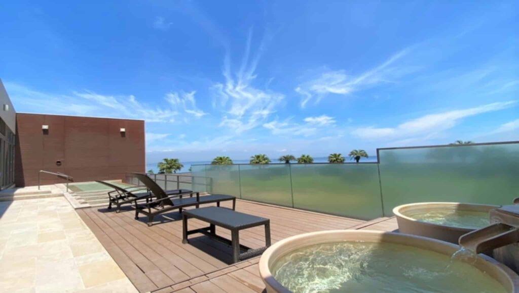 海を眺めながら入る露天風呂は、やはりこのホテル最大の魅力。屋根のない開放的な空間で、潮風を感じながら温泉に入れる贅沢は格別です。