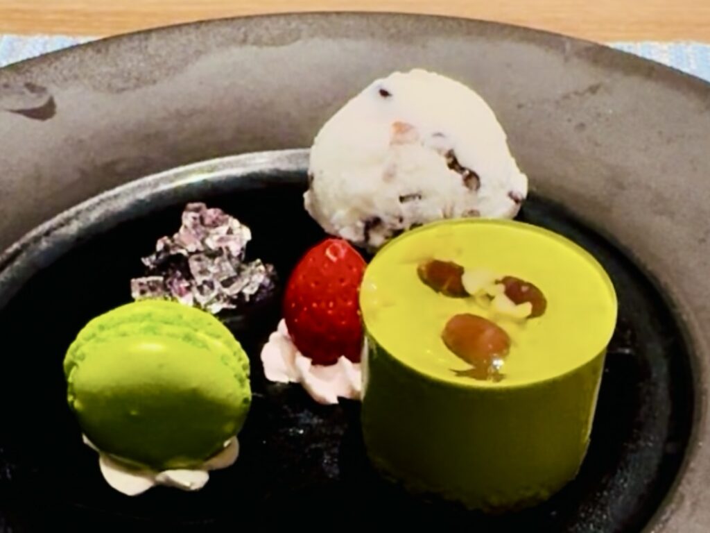 デザートは「ピスタチオのマカロン」「抹茶のムース」「あまおうと桜のホイップ」「桜のゼリー」「塩あずきアイス」です。