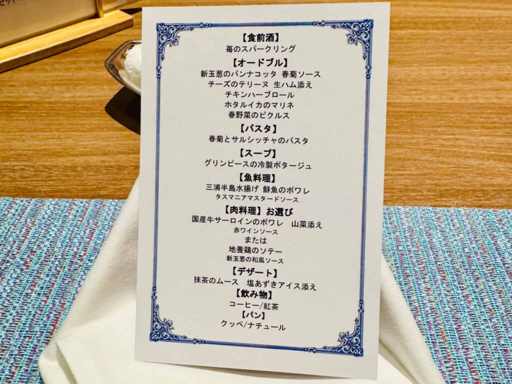 この日のメニューはこちらです。なお、実際にはメニュー表に載っていないお料理も提供されましたので、その内容は後ほどあらためてご紹介します。