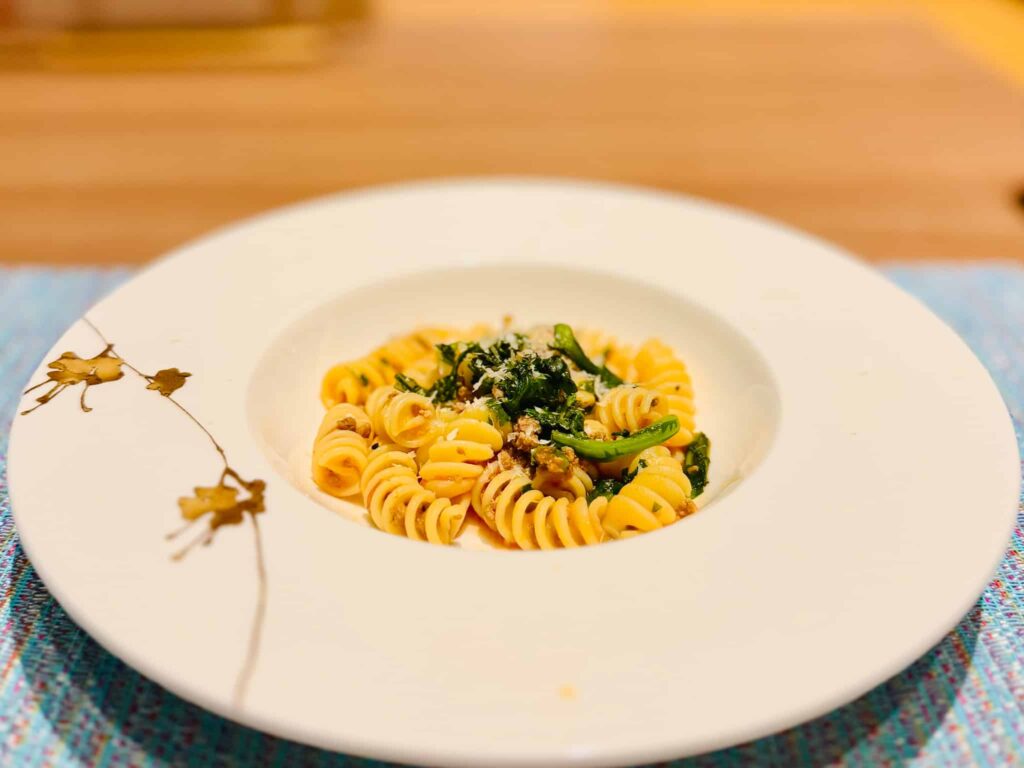 サルシッチャとはイタリアの加熱してない生のソーセージで塩気が強いのが特徴。ショートパスタのフリッジとの相性もよく春菊の苦みともマッチして美味しくいただきました。