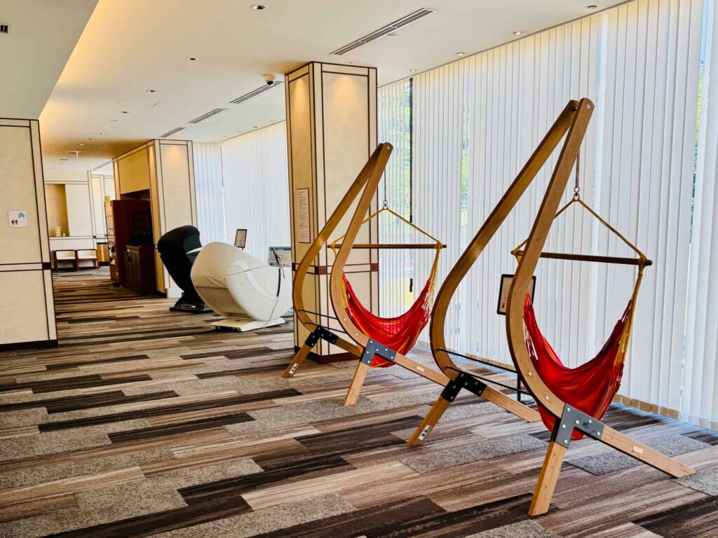 温浴施設「SPASSO」の2階には、湯上がりにゆっくり休憩できるスペースが用意されています。マッサージチェアで体をほぐしたり、ハンモックに揺られながらリラックスしたりと、思い思いの時間を過ごせます。