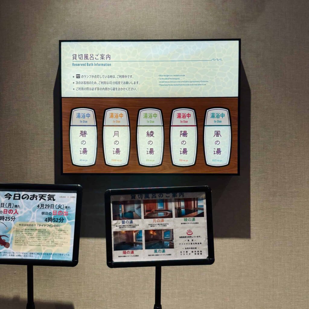 貸切風呂というと事前予約が必要なケースが多いですが、ここでは空いていればいつでも入浴可能。さらに貸切風呂は5つもあるため、タイミングをずらせば待つことなく利用できます。人目を気にせず温泉を満喫できる、贅沢なお風呂です。
