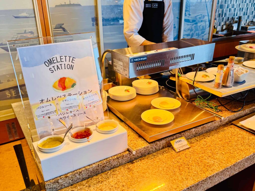 高級ホテルではおなじみのオムレツステーションも設けられており、目の前でシェフがふわとろのオムレツを仕上げてくれます。ソースは3種類から選べ、好みに合わせて味の変化を楽しめます。焼きたての滑らかな食感がたまりません。