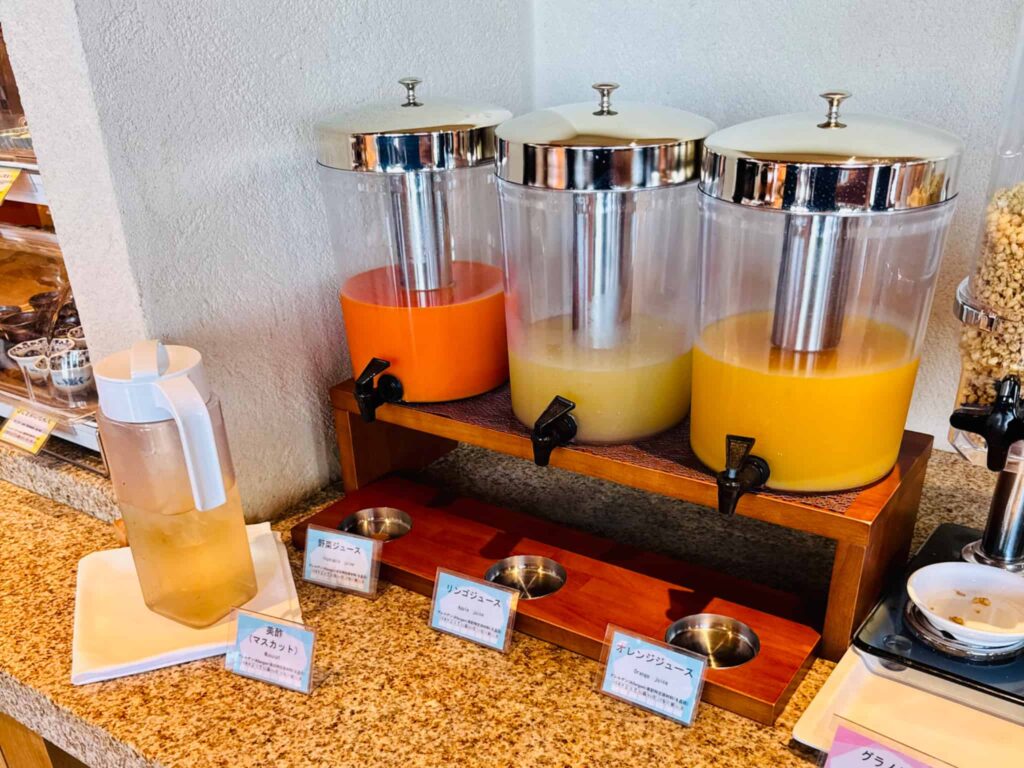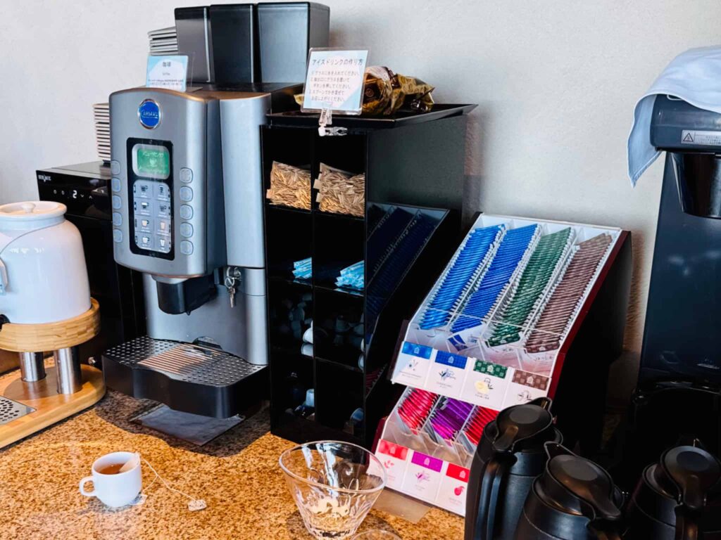 ドリンクは、コーヒーマシンをはじめ、緑茶・紅茶・ジュース(野菜、リンゴ、オレンジ)に加えて、マスカットのお酢ドリンクなど種類豊富に揃っています。