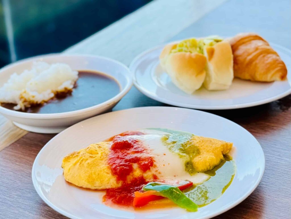 オムレツ(3種ソース掛け)、よこすか海軍カレー、ポテチパン、クロワッサン。